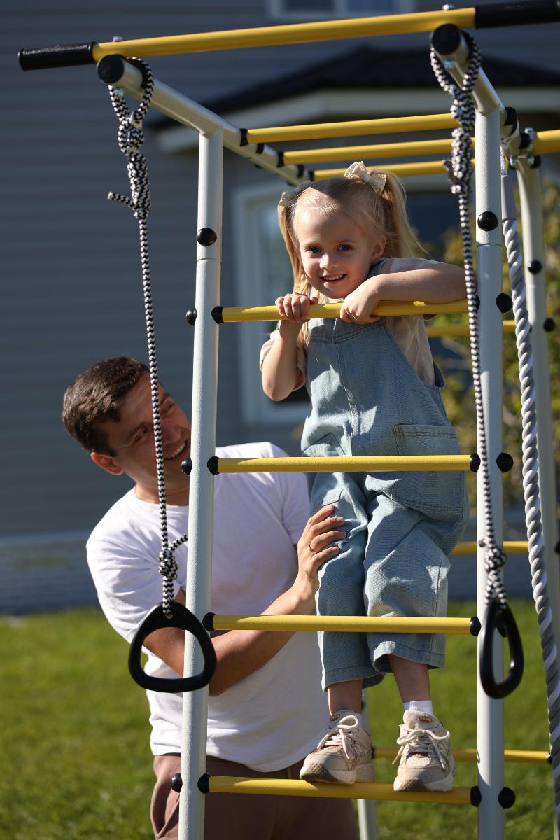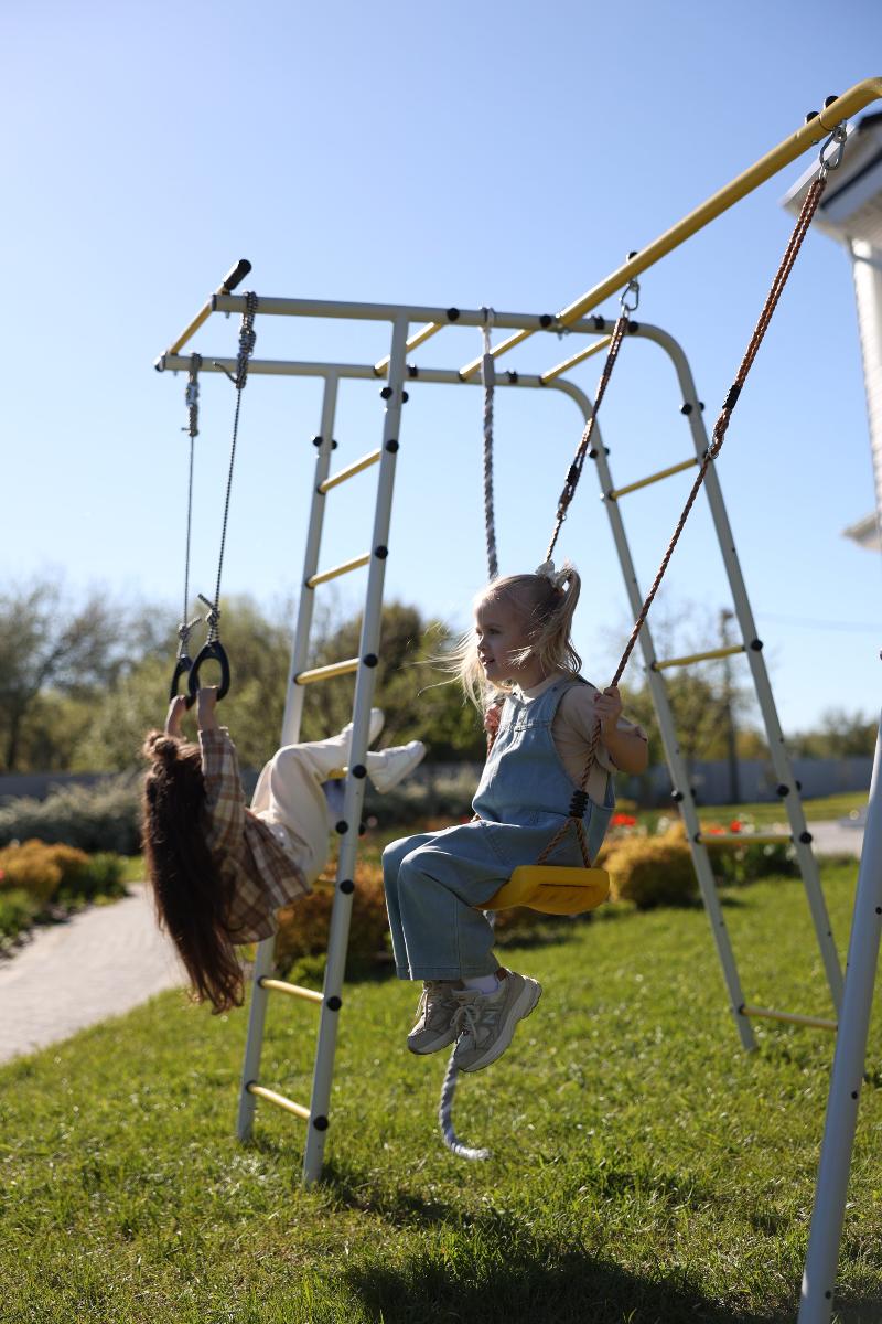 Конструкция спортивного комплекса обладает высокой прочностью и безопасностью для детей и взрослых, обеспечивая надежные условия для совместных занятий. Допустимая нагрузка на комплекс с турником и рукоходом составляет 100 кг, а на детское навесное оборудование - до 50 кг.