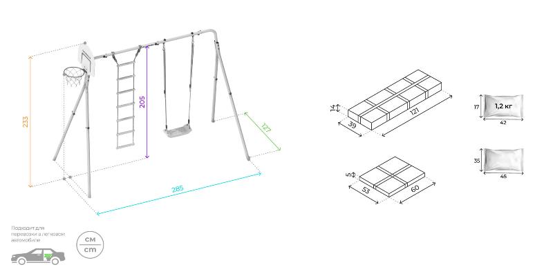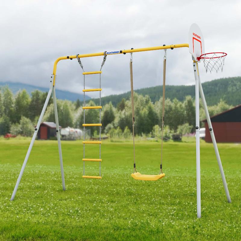 Спортивный каркас для качелей ROMANA PRO (Комплект № 5.2) - отличное решение для обустройства детской площадки как во дворе дома, так и на дачном участке. В комплект входят качели (на ваш выбор) и лаз с баскетбольным щитом, который может быть выполнен в виде каната с опорами или лестницы - выбирайте то, что больше всего подходит вашему малышу.