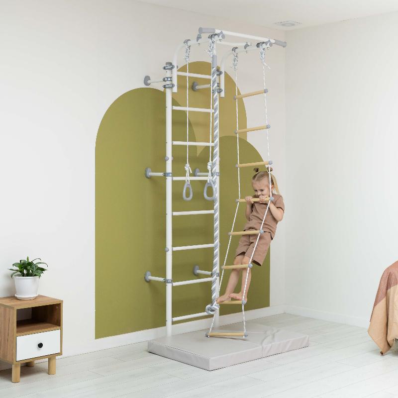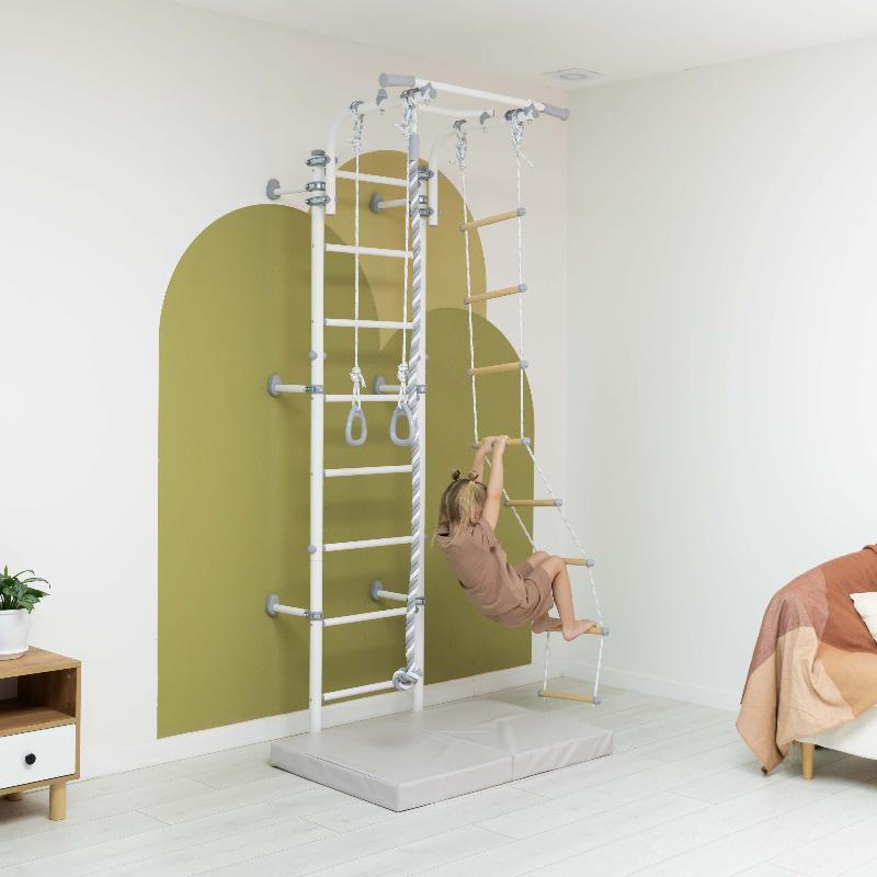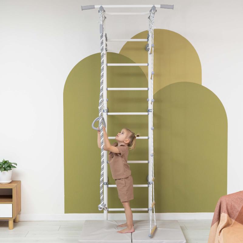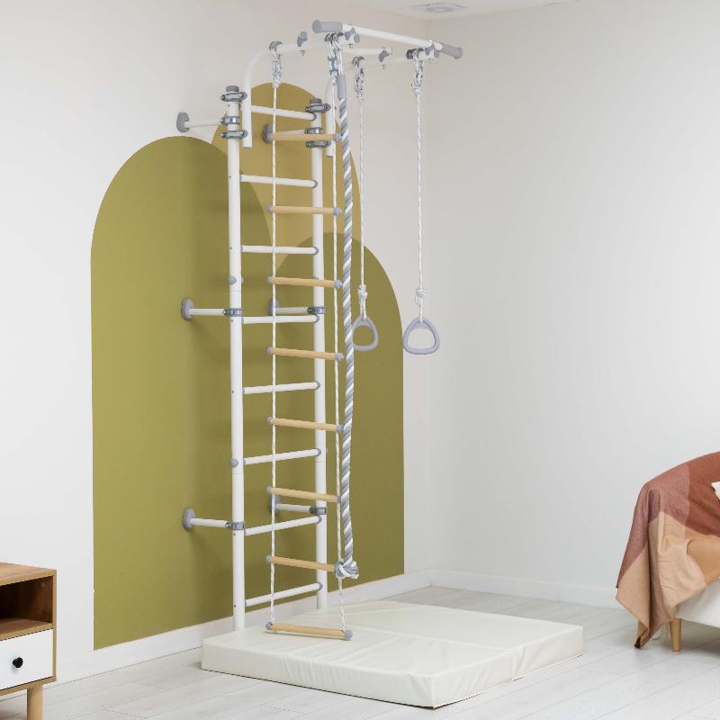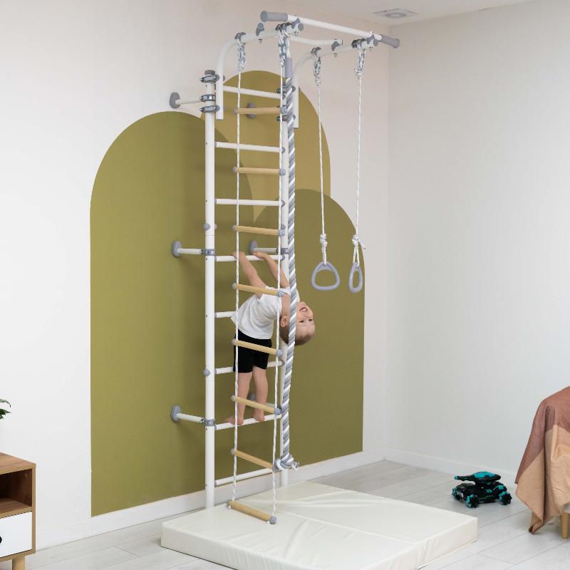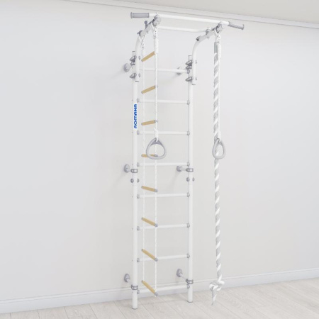 В комплекте с комплексом предоставляется подвижный турник, гимнастические кольца, веревочная лестница и канат. Металлическая конструкция оснащена специальными кронштейнами для крепления к стене, что гарантирует надежную установку и выдерживание установленной массы пользователя. Специальная обработка металла улучшает эксплуатационные характеристики.