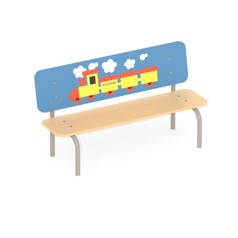 Скамья детская «Romana 302.09.00» двухцветная детская скамейка со спинкой для детских площадок, спортивных городков, детских садов. Спинка изделия декорирована рисунком «Поезд/ночь», выполненным «УФ»-печатью.
