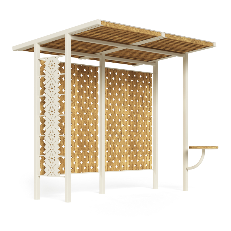 Каркас - металлопрокат сталь Ст3, покрытие - цинкосодержащий грунт, порошковая окраска (RAL по согласованию). Обшивка - дерево, покрытие - антисептик, масло террасное атмосферостойкое для древесины. Панели HPL. Декоративные части - монолитный поликарбонат не менее 3 мм.