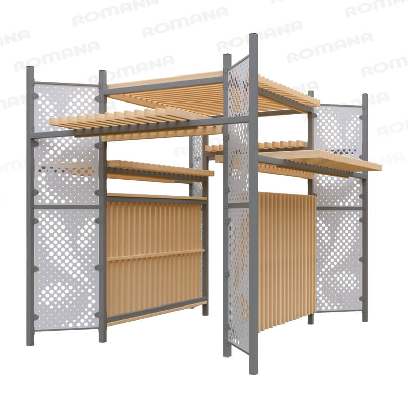 Навес классической квадратной формы с крышей из деревянных решеток, с горизонтальными тентами сверху на каждой из 4 сторон, под которыми удобно поставить садовые скамейки, с металлическими перегородками, идеально подходящими для вьющихся растений и цветов — это не только полноценная зона отдыха, но и украшение любой территории.