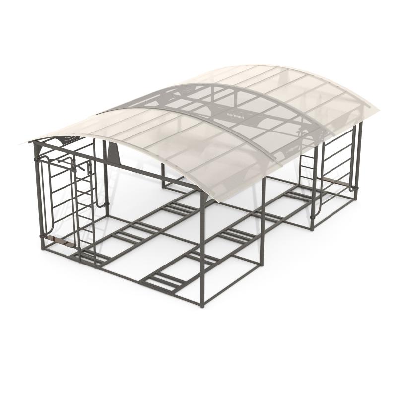 Навес предназначен для установки внутри него тренажеров на рамной конструкции с целью создания мобильных спортивных зон для занятия спортом независимо от времени года, так как крыша препятствует попаданию атмосферных осадков внутрь тренажерной площадки. Навес может эксплуатироваться круглогодично.Изделие представляет собой сборно-разборную конструкцию. Сборка производится при помощи резьбовых соединений. Конструктивно навес выполнен в виде рамы -основания, стоек и крыши.
