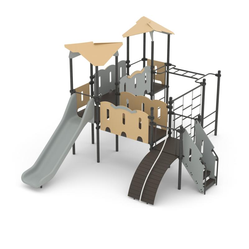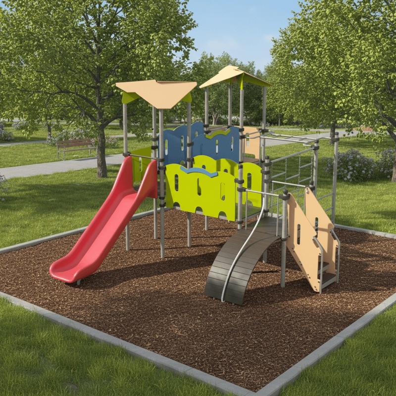 Игровой комплекс для тематических игр и физического развития предназначен для детей в возрасте от 8 лет. Изделие представляет собой сборно-разборную каркасную конструкцию из металлических труб, установленную на забетонированные стойки.Изделие устанавливается на открытых уличных участках, находящихся под контролем ответственного лица – эксплуатанта. Установка Изделия должна проводится на ровной площадке, свободной от насаждений. В зоне приземления должно быть ударопоглощающее покрытие (песок, древесные опилки) минимальной толщиной 300 мм