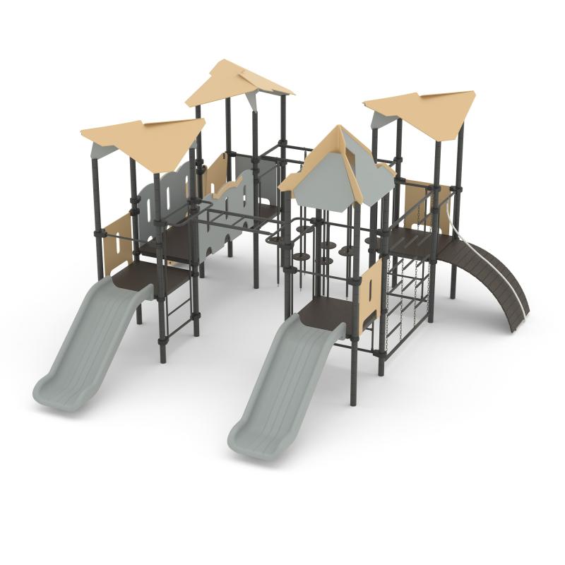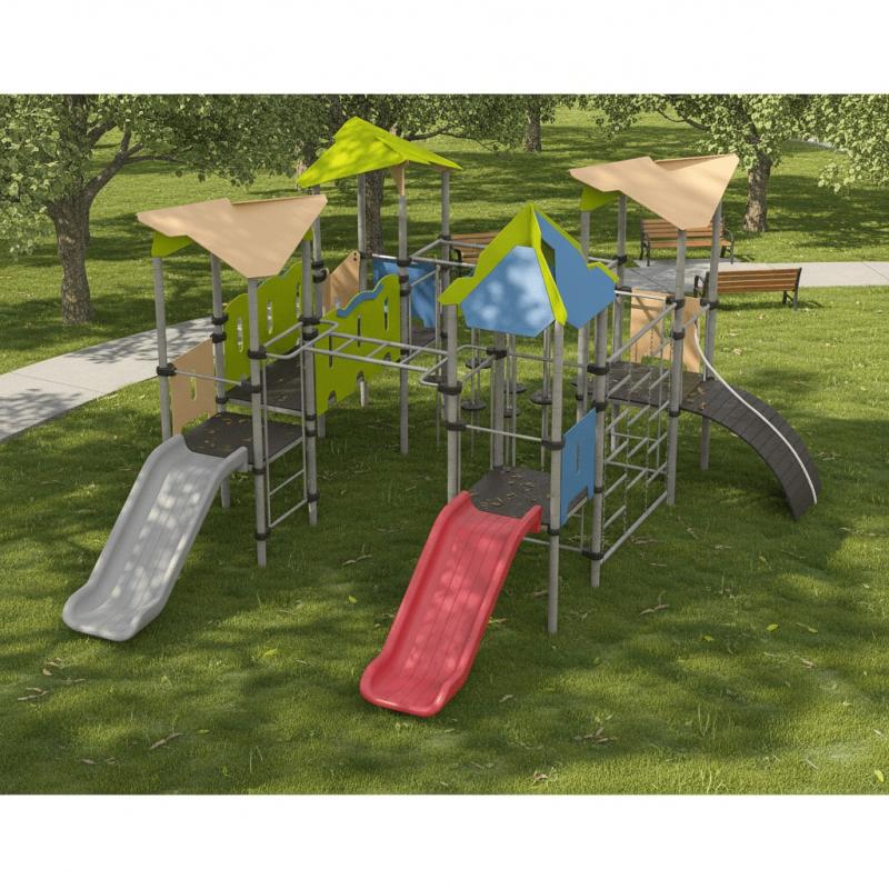 Детская площадка «Romana 101.12.00» - игровой комплекс с переходами, различными лесенками и горками, канатами и сеткой для лазанья. Помогает развить ребенку ловкость и гибкость, а так же укрепить мышцы.Изделие устанавливается на открытых уличных участках, находящихся под контролем ответственного лица – эксплуатанта. Установка Изделия должна проводится на ровной площадке, свободной от насаждений. В зоне приземления должно быть ударопоглощающее покрытие (песок, древесные опилки) минимальной толщиной 300 мм.
