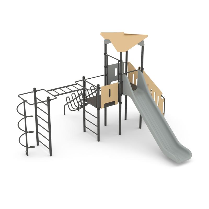Детская площадка «Romana 101.33.09» - комплекс домиком-горкой, лестницами, руколазами, турниками. Хорошо развивает координацию и ловкость у детей, укрепляет мышцы. Подходит для любых детских игровых площадок.Изделие устанавливается на открытых уличных участках, находящихся под контролем ответственного лица – эксплуатанта. Установка Изделия должна проводится на ровной площадке, свободной от насаждений. В зоне приземления должно быть ударопоглощающее покрытие (песок, древесные опилки) минимальной толщиной 300 мм
