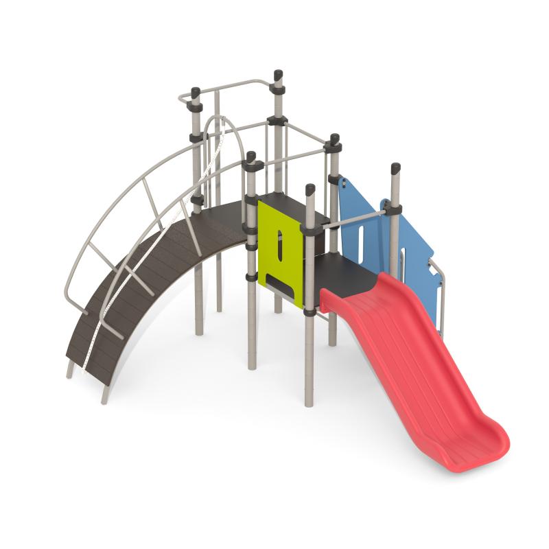 Игровой комплекс для тематических игр и физического развития предназначен для детей в возрасте от 8 лет. Изделие представляет собой сборно-разборную каркасную конструкцию из металлических труб, установленную на забетонированные стойки.Изделие устанавливается на открытых уличных участках, находящихся под контролем ответственного лица – эксплуатанта. Установка Изделия должна проводится на ровной площадке, свободной от насаждений. В зоне приземления должно быть ударопоглощающее покрытие (песок, древесные опилки) минимальной толщиной 300 мм.
