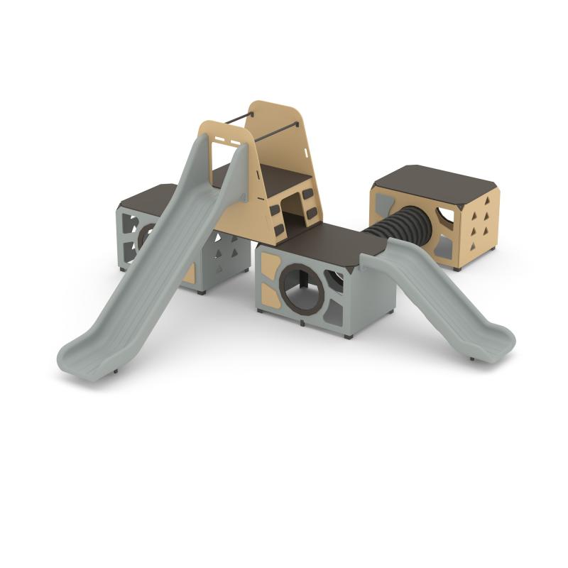 Игровой модуль для тематических игр и физического развития предназначен для детей в возрасте от 4 до 12 лет. Изделие должно представлять собой устойчивую конструкцию, обеспечивающую безопасные условия для занятий на открытом воздухе. Конструкция должна обладать высокой ударопрочностью и виброустойчивостью.В сборе представляет собой конструкцию в виде трех прямоугольных площадок, собраных со стенками с помощью уголков, установлены на грунтозацепы. Две площадки присоединены друг к другу с помощью лаза-труба. С одной стороны одной из площадок установлена горка 950 мм. На две площадки прямоугольные установлен игровой модуль треугольный, к которому присоединена Горка 1550 мм.Изделие устанавливается на открытых уличных участках, находящихся под контролем ответственного лица – эксплуатанта. Установка Изделия должна проводится на ровной площадке, свободной от насаждений. В зоне приземления должно быть ударопоглощающее покрытие (песок, древесные опилки) минимальной толщиной 300 мм.