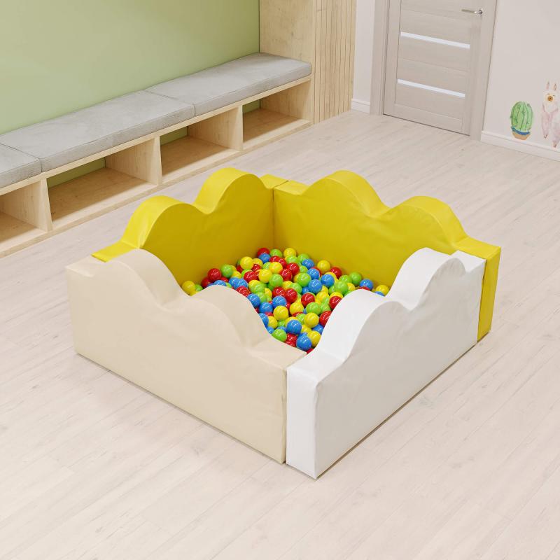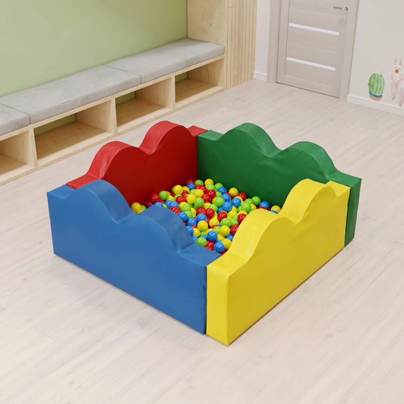 Сухой бассейн с шариками «Волна» - необычный бассейн с волнистыми бортами для детской комнаты или дачного участка. Сухой бассейн собирается из отдельных элементов, которые крепятся друг к другу с помощью липучек. Мягкие бортики в форме волн и такой же мягкий мат, выполняющий роль дна, обеспечивают малышу полный комфорт и безопасность во время игры. Дно и стенки бассейна, изготовлены из поролона и обтянуты качественной износостойкой винилискожей. Вместо воды такой резервуар заполняется пластмассовыми шариками (входят в комплектацию 300 шариков), «плавая» в которых дети развивают координацию движений, мелкую моторику и получают полезный расслабляющий массаж всего тела. Помогает малышу развивать мелкую моторику, знакомиться с цветами и объёмами предметов. Габаритные размеры 1400 х 1400 x 400 мм. Отлично моется. Вес с упаковкой 12,5 кг.